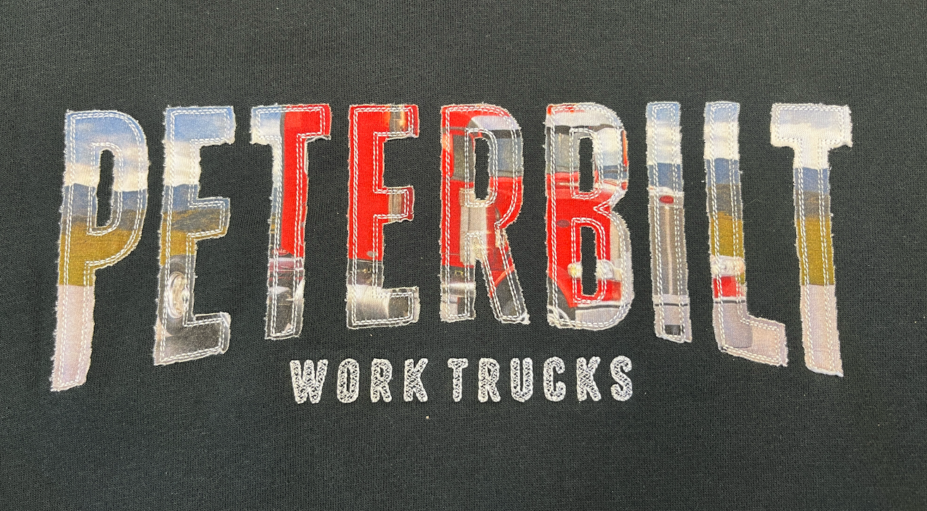 Black hoodie with truck design in embroidered Peterbilt lettering